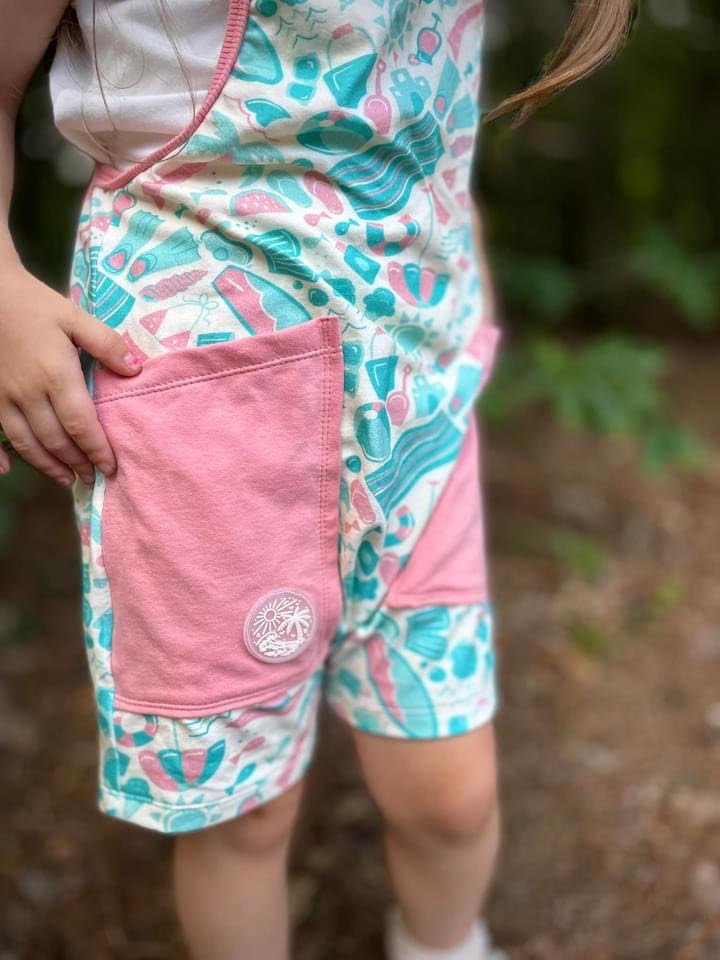 Pastel beach themed pattern printed on Organic Cotton and Bamboo. Printed by Natural Roots Fabrics.
